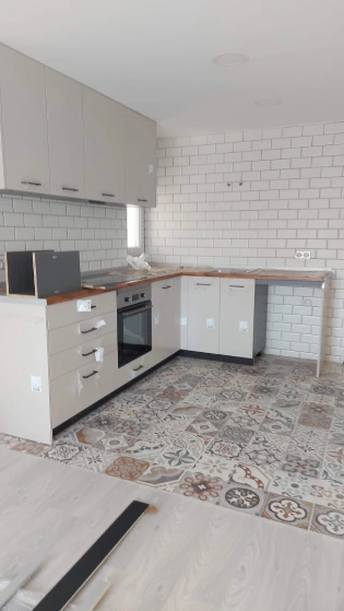La renovación de la cocina en «Puerto 25» reeja una elegancia contemporánea con un toque cálido. El suelo de baldosa hidráulica y las paredes alicatadas en blanco se complementan con una bancada de madera, creando un ambiente moderno y acogedor.