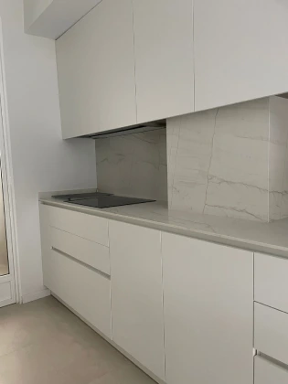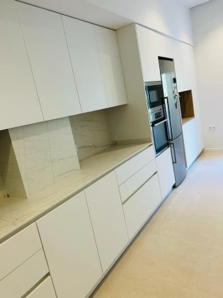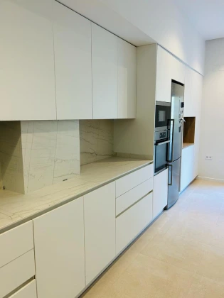 Experimenta la luminosidad y la calidez terrosa en la cocina de «Sorni 11-C», donde hemos llevado a cabo una reforma completa. El suelo en tonos tierra establece un ambiente acogedor, mientras que los muebles blancos y la bancada de piedra porcelánica con vetas de mármol añaden toques de lujo.